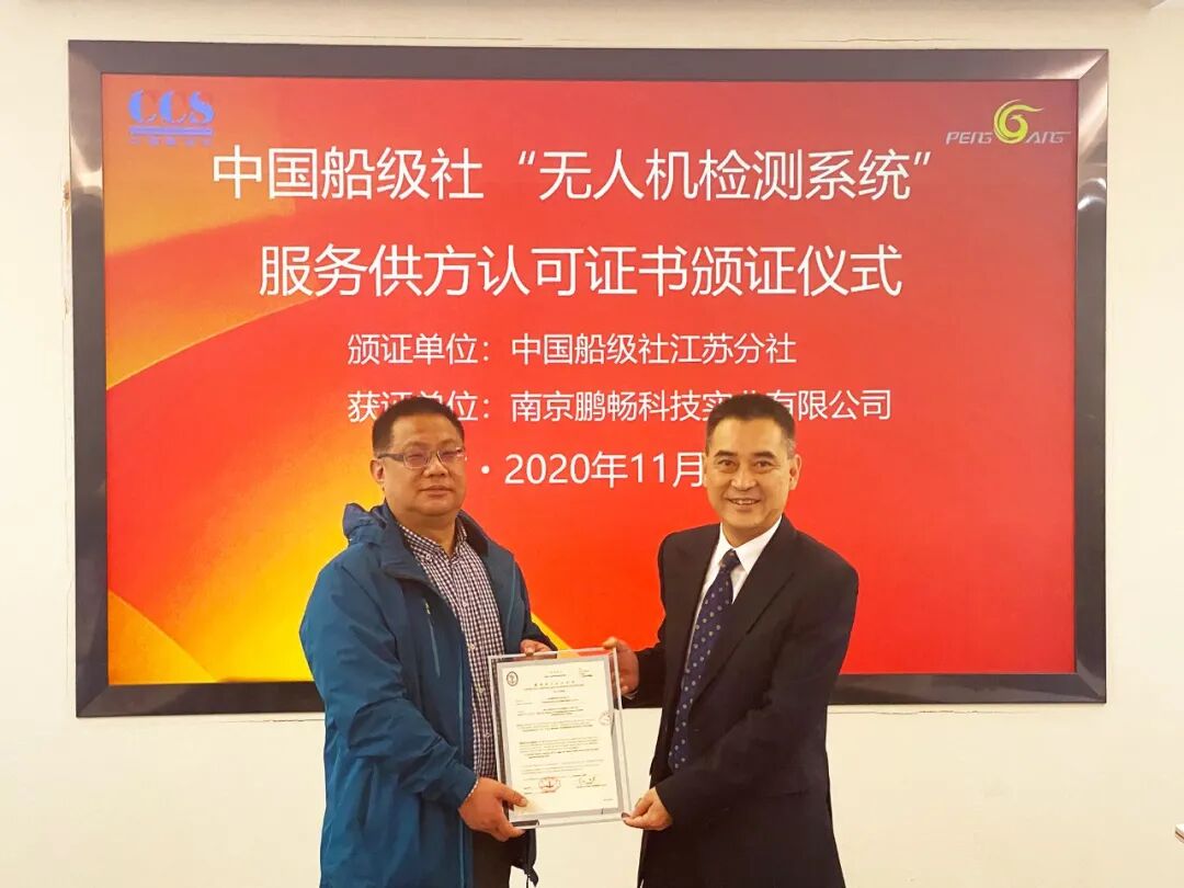 11月16日上午,船级社(CCS)江苏分社副总经理杨琪向南京鹏畅科技实业有限公司颁发了船级社CCS首张“无人机远程检查替代近观检验”供方认可证书。这标志着船级社CCS在无人机远程检查技术领域迈入商业化推广应用阶段。